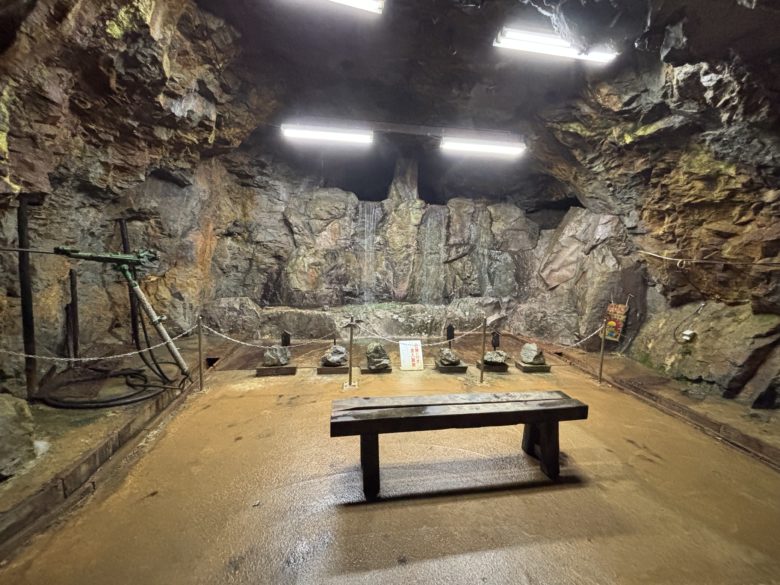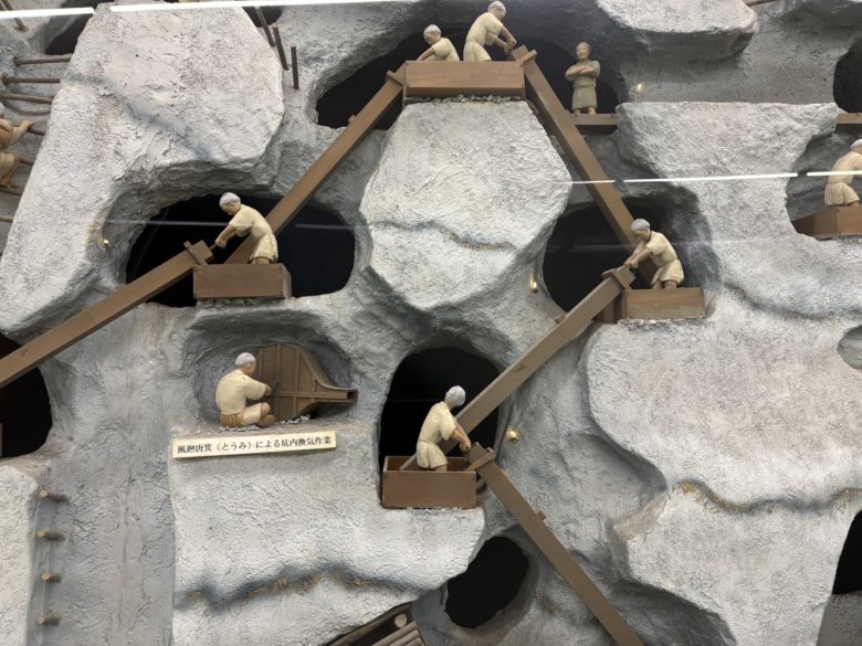 驚くべきは、江戸時代の採掘作業の方法。なんと、「のみ」一本で岩を削り、手作業で坑道を掘り進めていたのです。マネキンたちはかなり余裕な表情ですが重機も電気もない時代、狭く暗い坑道の中で、少しずつ岩を削っていく作業は過酷そのもの。1日で15センチしか進めなかったと言います。