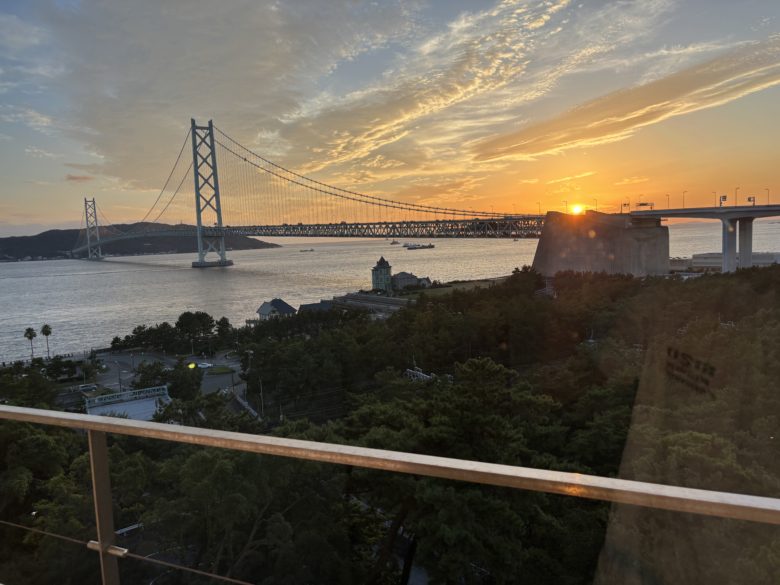 カーテンを開ければ、舞子公園の綺麗な緑と大迫力の明石海峡大橋の絶景!夕日が沈む景色はとても美しく、家族で感動しました。