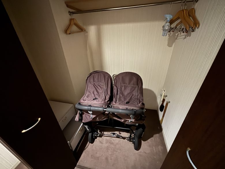 入り口付近にあるウォークインクローゼットも広く双子ベビーカーも楽々入るほどのスペース。