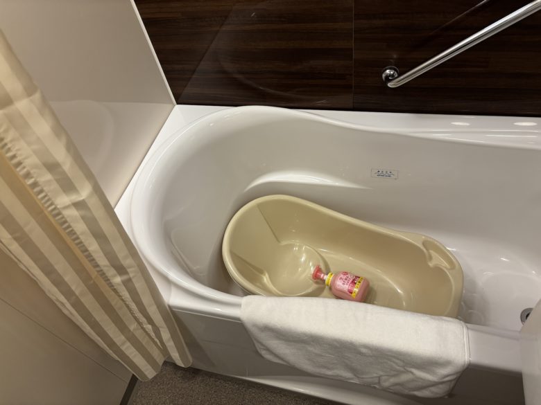 ただ、我が家のベビーはまだ小さいため部屋のお風呂で済ませました。部屋のタイプによると思いますが、よくある3点ユニットバスなので少し狭かったです。